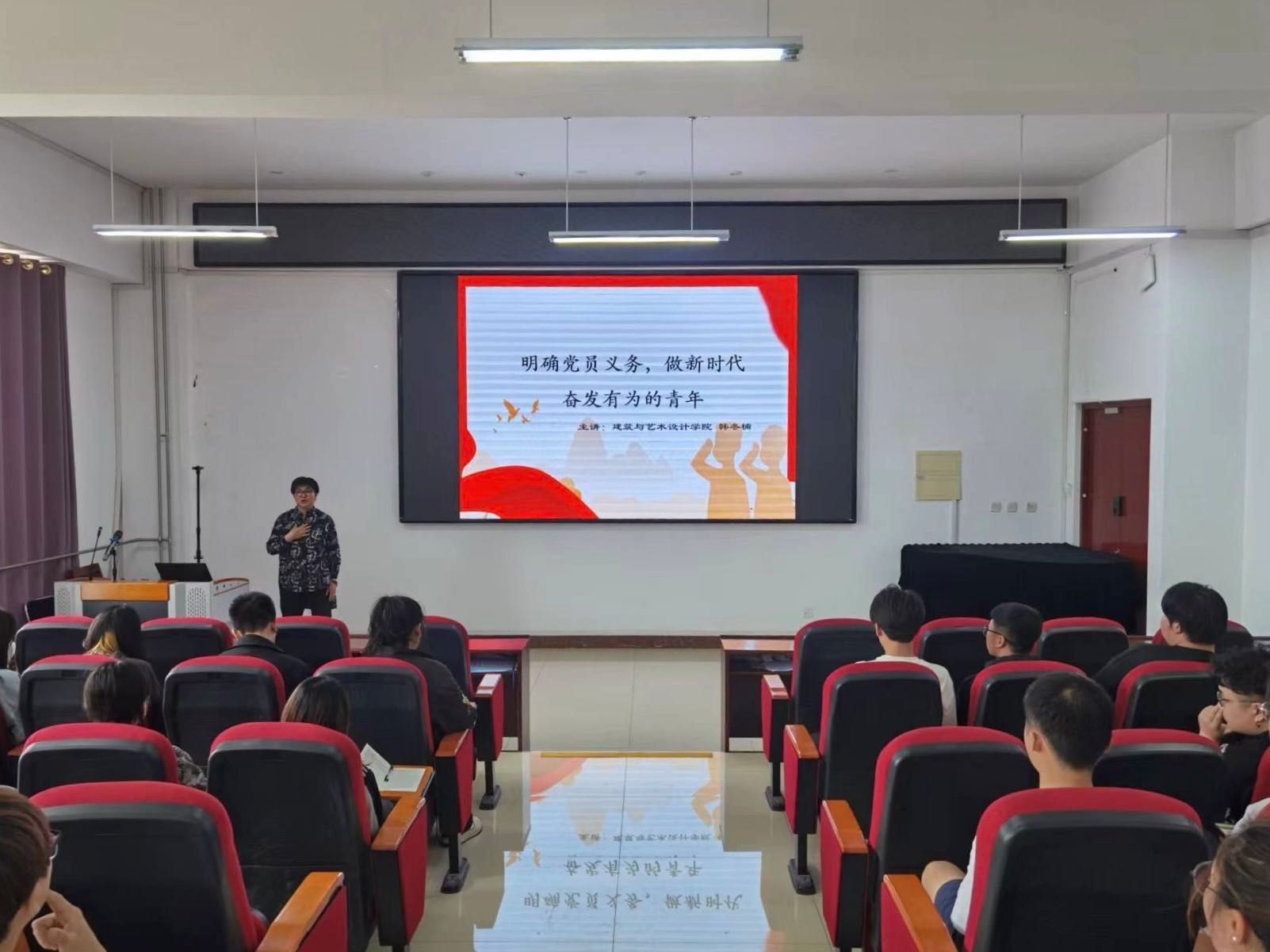 韩院长首先详细地讲授了党章的修改次数和修改内容和如何成为一名共产党员的流程,通过例举具体案例讲述了“红船精神”,最后,强调了习近平总书记对新时代中国青年提出6点要求。