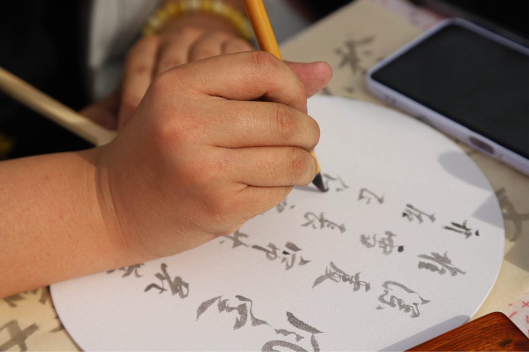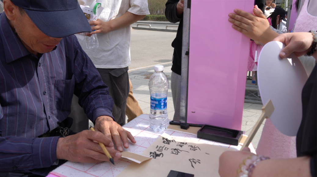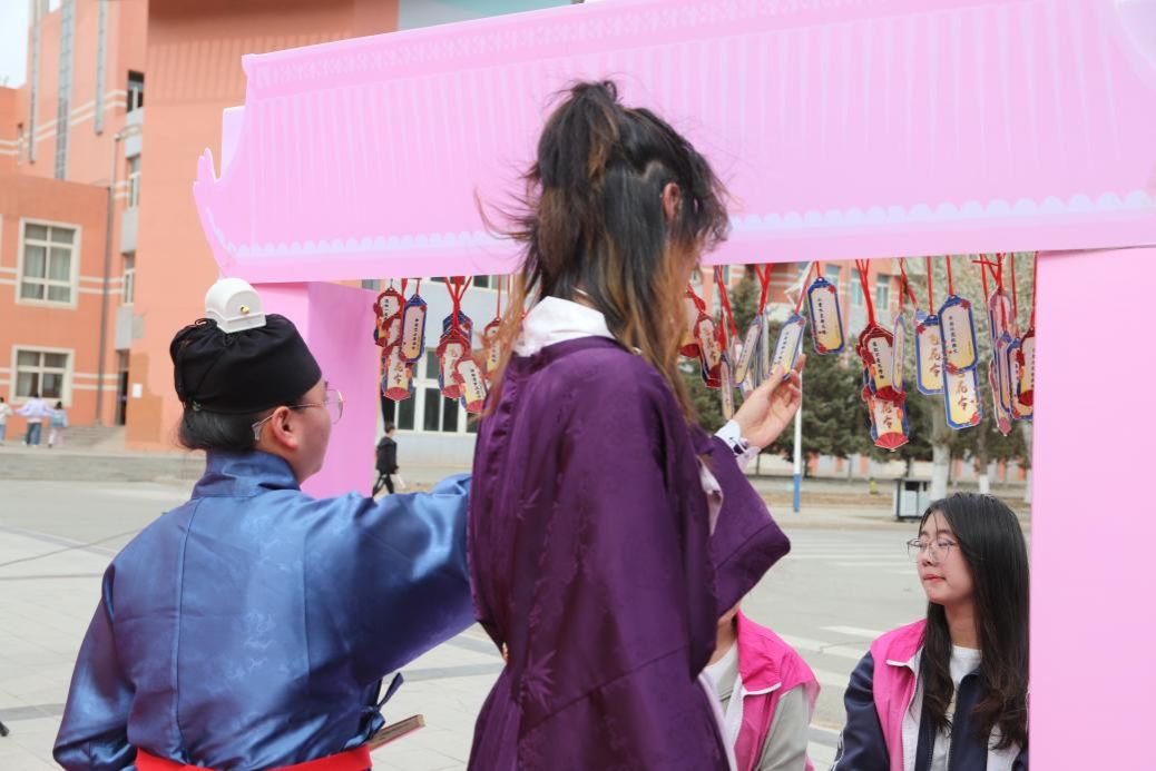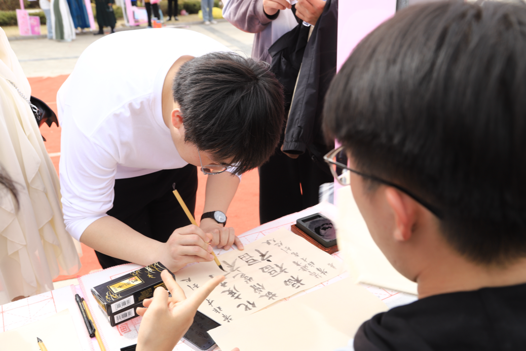 活动现场,有的同学身着汉服,沉浸式体验中华传统赏春项目,还进行了古筝、丽人行、歌曲等节目表演,随着古风古色的旋律、打动人心的歌声与舞蹈,让同学们身临其境的感受着春日校园的古风画意,在春日的映衬下为同学们带来一场视觉与文化的双重盛宴,吸引着众多途径的师生和校园工作人员驻足于此,与我们一起在互动环节,吟诗作赋,书写墨韵。此次活动还意外吸引到一位“鹤发校友”,他欣然提笔,在同学们的赞叹和欢笑声中为大家留下了美好的春日祝福。