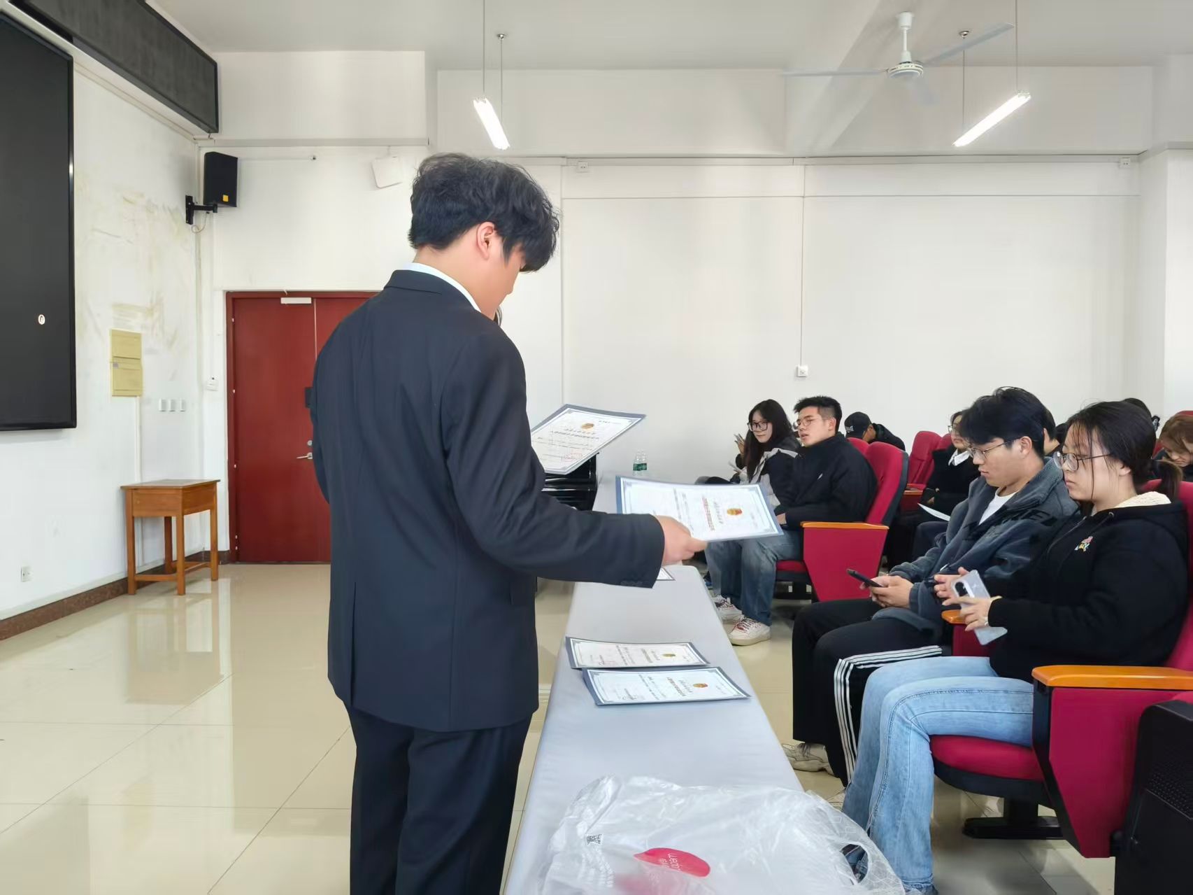 团委在明德楼B401召开本次团课闭幕式。团课的闭幕宣告这本期团课的结束,通过考核的学生共有87人,准予毕业,并颁发毕业证书。
