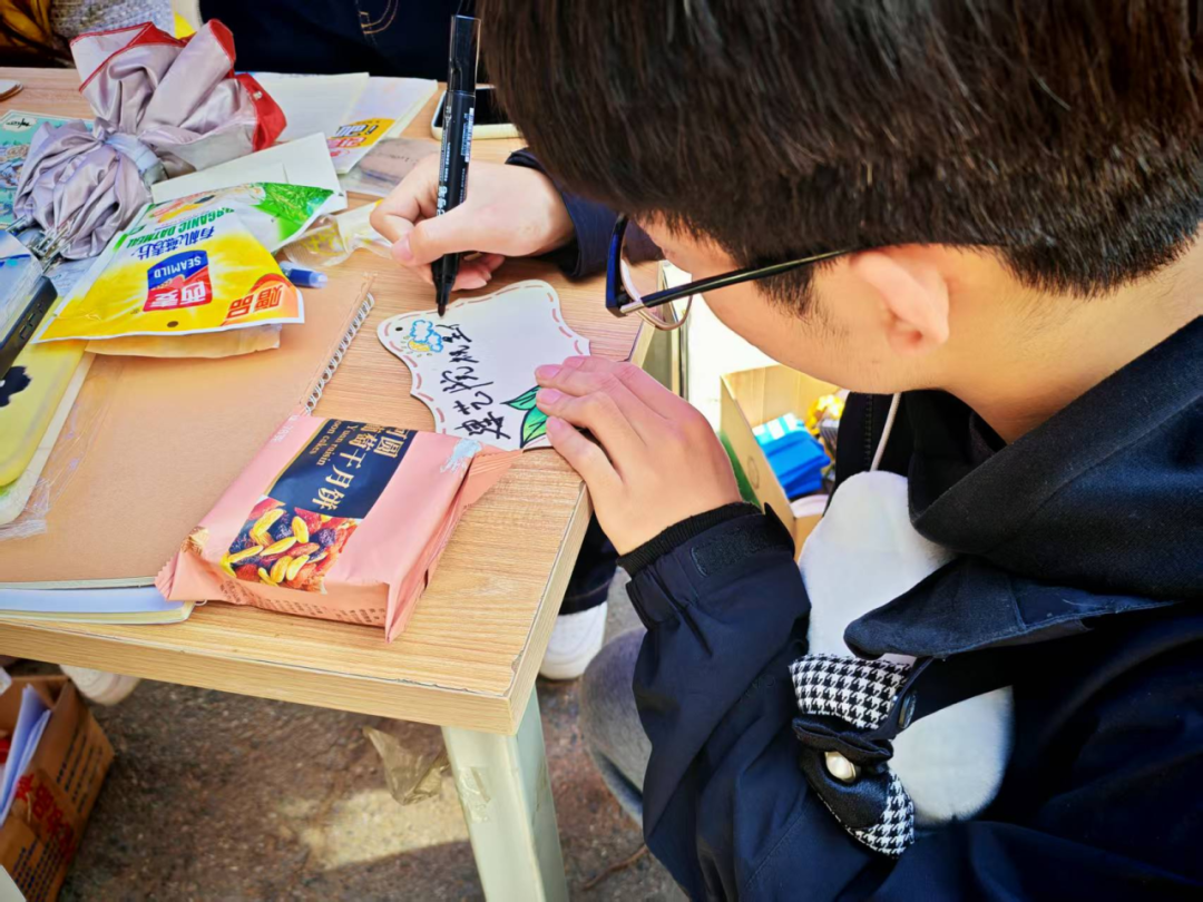 活动现场设置环保义卖专区,志愿者们精心布置摊位,各类闲置好物被有序摆放,倡导循环利用、低碳消费。参与者在选购爱心物品的同时,可在定制树牌上写下对校友的祝福与寄语,卡片将统一悬挂于校友林,让青春寄语与绿树相伴生长。